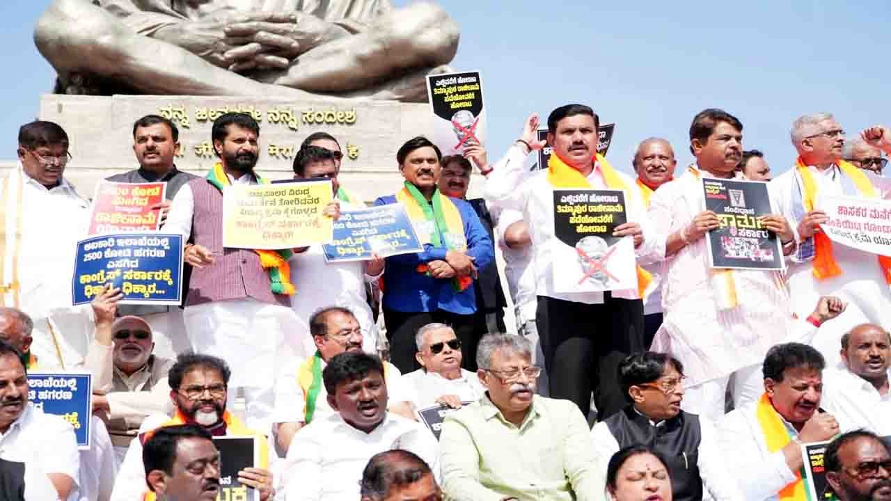 ರಾಜ್ಯ ವಿಧಾನಸಭೆಯ ಜಂಟಿ ಅಧಿವೇಶನದ ಸಂದರ್ಭದಲ್ಲಿ ರಾಜ್ಯಪಾಲ ಥಾವರಚಂದ್ ಗೆಹ್ಲೋತ್ ಅವರನ್ನು ‘ಅವಮಾನಿಸಿದ ಮತ್ತು ಅಗೌರವಿಸಿದ’ ಆರೋಪದ ಮೇಲೆ ಕೆಲವು ಕಾಂಗ್ರೆಸ್ ಶಾಸಕರನ್ನು ಅಮಾನತುಗೊಳಿಸಬೇಕೆಂದು ಒತ್ತಾಯಿಸಿ ಪ್ರತಿಪಕ್ಷ ಬಿಜೆಪಿ ಮತ್ತು ಜೆಡಿಎಸ್ ಮಂಗಳವಾರ ವಿಧಾನಸೌಧದ ಮಹಾತ್ಮ ಗಾಂಧಿ ಪ್ರತಿಮೆ ಮುಂದೆ ಪ್ರತಿಭಟನೆ ನಡೆಸಿದವು.